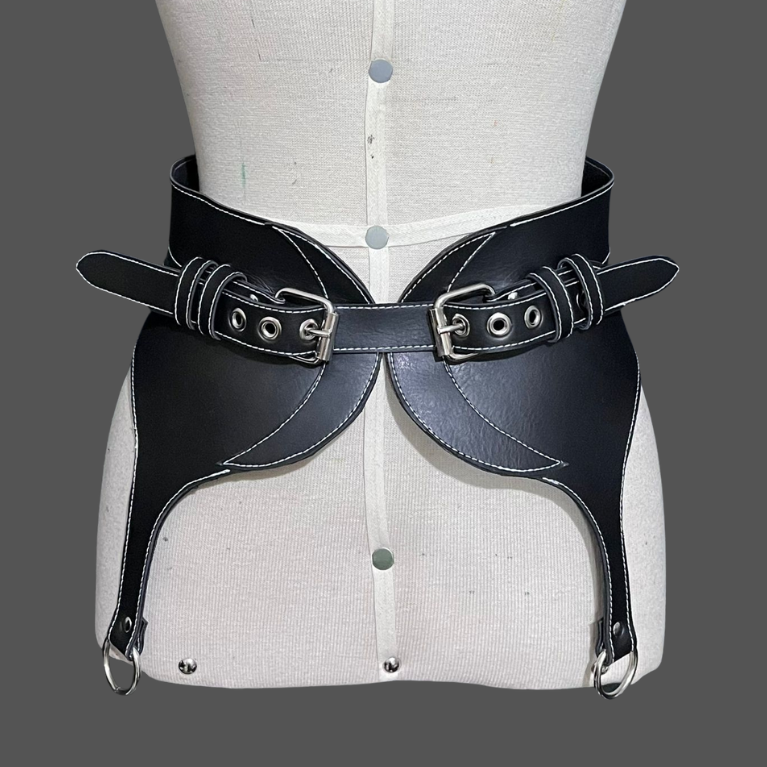 Cinto em couro sintetico,com fechamento com fivelas frontal e modelagem inspirada em cintas ligas.